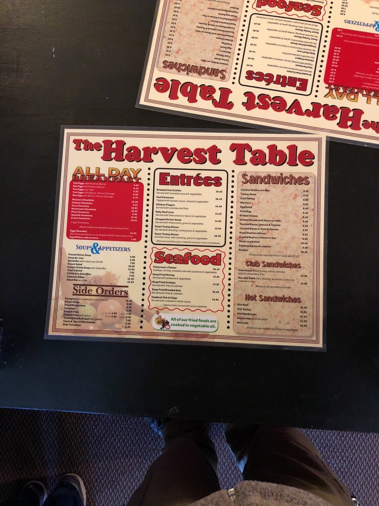 Details & Description. Come taste a yummy meal at Harvest Table Family Restaurant The. Discover a menu featuring comfort food and hamburgers, priced at 11$ to 25$ and experience their casual ambiance. They are open at night from Monday to Friday. You can pay by MasterCard, American Express and Visa.