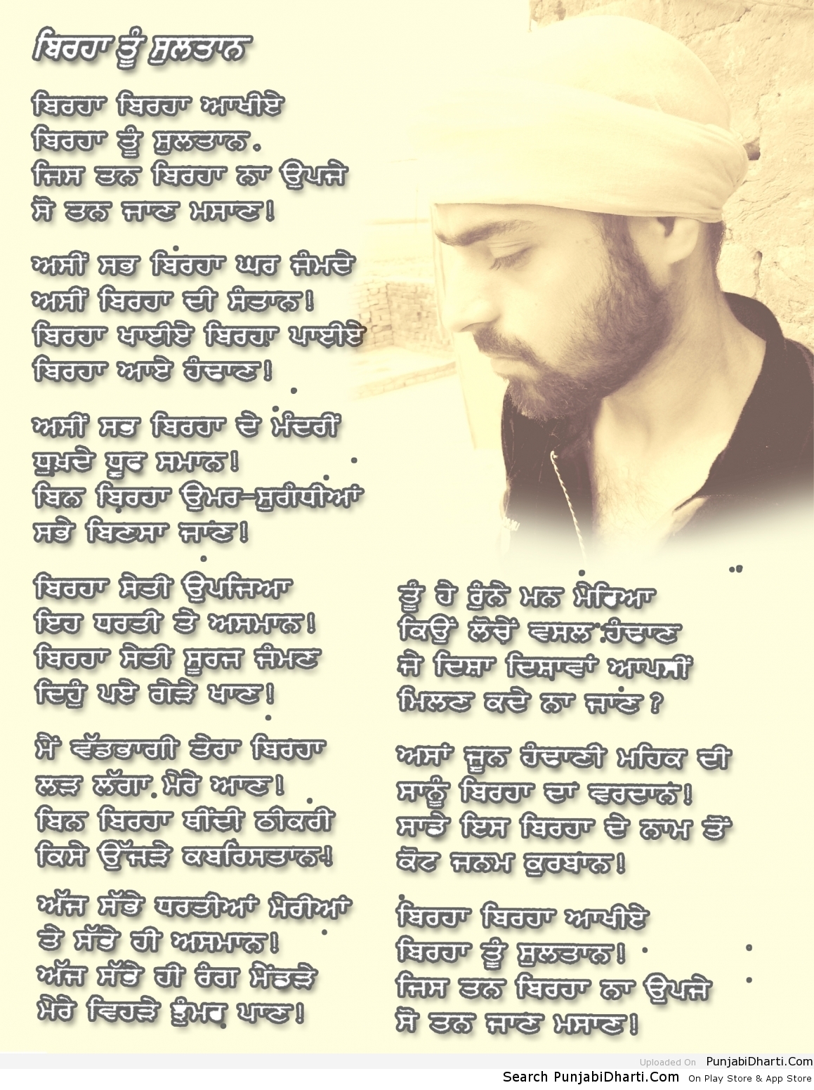 Birha birha aakhiye, Birha tu sultaan, Jis tan birha na upaje So tan jaan masaan. AseeN sabhe birha ghar jammade, AseeN birha di santaan, Birha khaaeeye birha paaeeye, Birha aaye haNDaaN. AseeN sab birhaaN de mandareeN, Dhukde doof masaan, Bin birha umar sugaNdheeyaaN Sabhe binsa jaan. Birha seti upajiya, Eh dharti te asmaan, Birha seti sooraj.