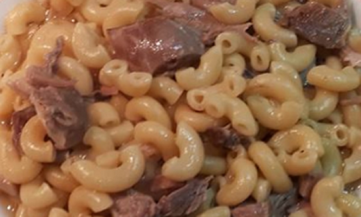 Dans une casserole d'eau bouillante salée, cuire les pâtes jusqu'à ce qu'elles soient al dente. Égoutter et huiler légèrement les pâtes. Réserver. Dans la même casserole, attendrir l'oignon et l'ail dans l'huile à feu moyen environ 3 minutes. Déglacer avec le vin, la moutarde et le jus de cuisson. Porter à ébullition.